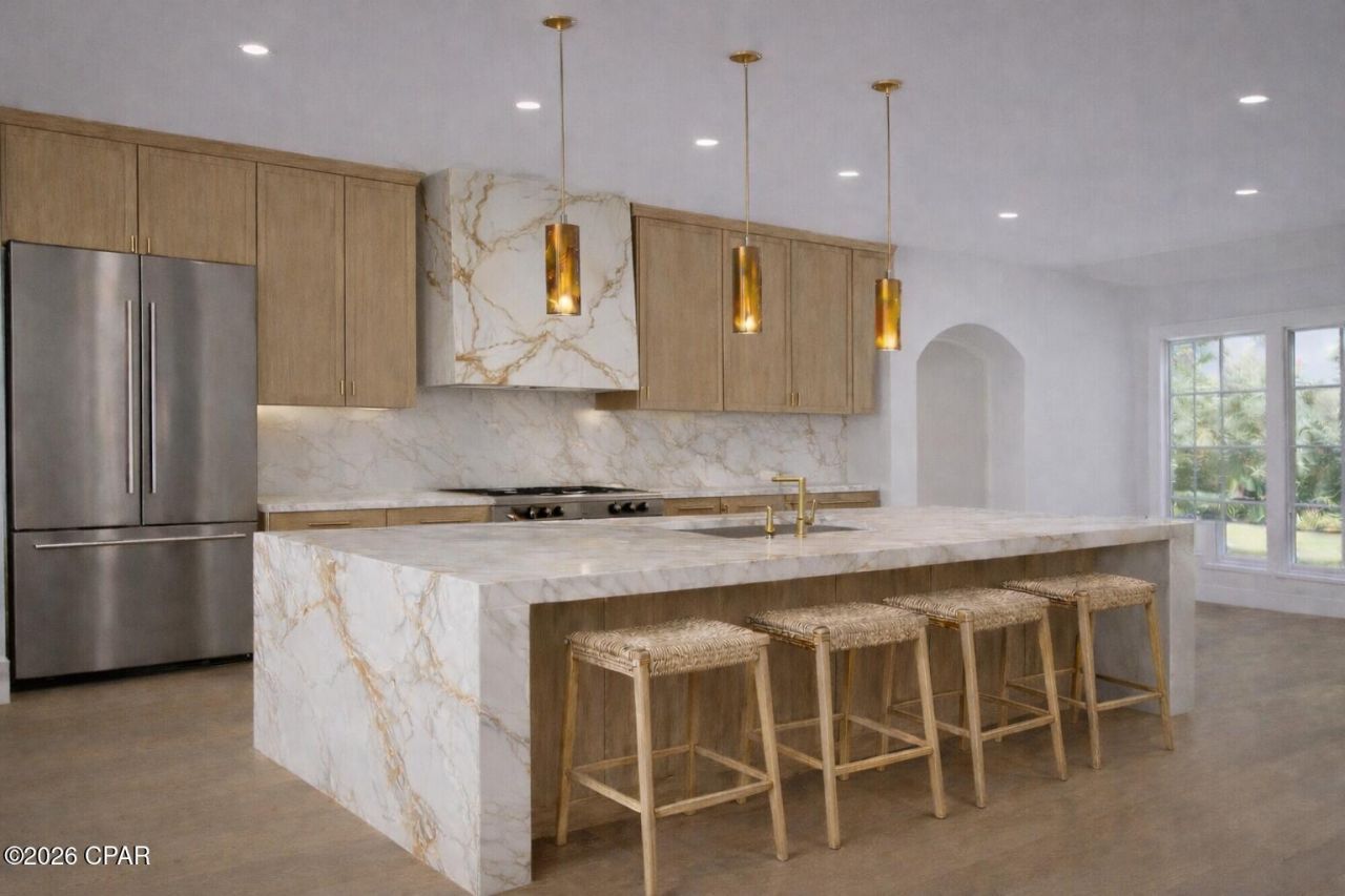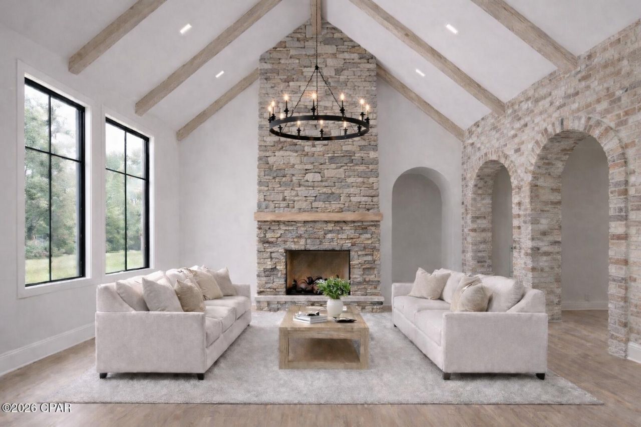 This home is the Bay Building Industries Association Scholarship Home, a special project that helps provide scholarships to local students in our community. It is also featured as a Parade of Homes showcase property, highlighting quality construction and thoughtful design, and attention to detail throughout. Experience the quality and craftsmanship of this beautiful new construction home being built by local builder G6 Development Company, known for thoughtful design and attention to detail. Built with 2x6 exterior framing, this home offers enhanced durability, energy efficiency, and long-term value. Along with spray foam insulation for additional energy efficiency. As you step inside, you're welcomed by 16-foot cathedral ceilings in both the living and dining rooms, creating a bright and open atmosphere, while 10-foot ceilings throughout the rest of the home maintain a spacious feel in every room. The living room is anchored by a stunning floor-to-ceiling stone fireplace, serving as a warm and inviting focal point. Elegant custom arched entryways throughout the main living space add architectural charm and character. The luxury style kitchen is a true centerpiece, featuring quartz countertops, natural wood-tone cabinetry, a quartz backsplash, and a custom quartz vent hood. The thoughtfully designed layout includes both a butler's pantry and an additional walk-in pantry, providing abundant storage and functionality for everyday living or entertaining. Off the dining room, a rustic style wet bar showcases custom cabinetry and a brick backsplash, adding warmth and a perfect space for hosting guests. The home's split floor plan offers privacy and convenience. On the right side of the home, you'll find three bedrooms and a full bathroom, ideal for family or guests. The left side of the home is dedicated to the spacious primary suite, complete with a tray ceiling and a beautifully designed spa-like bathroom featuring a walk-in shower, deep soaking tub, dual vanities, and a private water closet. The suite also includes a generous walk-in closet with plenty of room for storage and organization. Blending modern luxury with rustic warmth, this home offers custom details, functional design, and exceptional craftsmanship throughout.