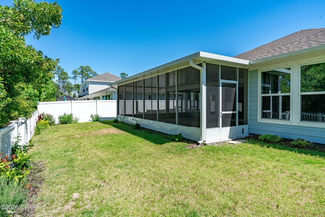 Enjoy protected conservation views with no rear neighbors from this beautifully maintained David Weekley-built home in Breakfast Point -- one of Panama City Beach's most established and sought-after primary-residence communities. David Weekley homes are known locally for thoughtful floor plans and quality construction, and this layout offers a smart split-bedroom design that balances openness with privacy. Natural light fills the main living areas, where the open-concept kitchen, dining, and family room create an effortless flow for everyday living or entertaining. A standout feature is the 4-panel sliding glass door that opens fully from the main living space to the expansive 28' x 22' screened patio, creating true indoor-outdoor living. This design not only brings in abundant natural light but also allows the living area to expand seamlessly into the covered outdoor space -- ideal for gatherings, game days, or quiet evenings overlooking preserved green space. The kitchen serves as the heart of the home with abundant cabinetry, generous counter space, and a spacious breakfast bar that naturally becomes the gathering spot. A secondary bedroom with its own private bath provides flexibility for guests, multigenerational living, or a teen suite -- a feature not found in every Breakfast Point floor plan. The primary retreat includes a spacious bedroom, oversized super-shower, and an expansive walk-in closet. Practical upgrades further enhance daily living. The 3-car garage provides valuable parking and storage flexibility, and additional decking installed in the attic above the garage offers substantial extra storage -- a rare and highly functional feature in this neighborhood. The separate laundry room adds convenience and includes a 3-year-old Consumer Reports top-rated washer and dryer. Recent maintenance updates include a new HVAC capacitor (July 2025), new hot water heater expansion tank (July 2024), updated drapes and blinds, and an in-wall safe. Breakfast Point continues to be one of Panama City Beach's most desirable full-time residential neighborhoods, offering sidewalks throughout, parks, and easy golf cart access to top local schools, Pier Park, Frank Brown Park, and the white-sand beaches just minutes away. Publix, dining, and everyday conveniences are located directly outside the community entrance. For buyers seeking privacy, a reputable builder, flexible living space, and meaningful storage within a walkable, family-oriented setting, this property represents a strong opportunity in today's Breakfast Point market.
