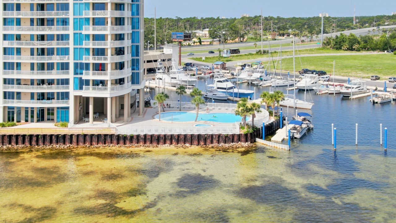 Experience waterfront living at Marina Landing with this 2-bedroom, 2-bath high-rise condo offering 1,384 sq. ft. of comfortable coastal living. This 8th-floor unit showcases stunning panoramic views of St. Andrews Bay from every room and features an expansive balcony with a built-in grill?perfect for entertaining or relaxing at sunset. Both bedrooms are bayfront suites with balcony access and walk-in closets. The primary bathroom includes a double vanity, separate tiled shower, and soaking tub. The open-concept living and dining area is highlighted by floor-to-ceiling windows that fill the space with natural light. Marina Landing offers resort-style amenities including a bayfront pool and spa, fitness center, picnic area, and boat launch access. One assigned covered parking space is included. This community does not allow short-term rentals, providing a serene and private atmosphere for full-time residents or second-home owners. All information is deemed accurate but should be verified by the buyer and/or buyer's agent if important. Schedule your private showing today!